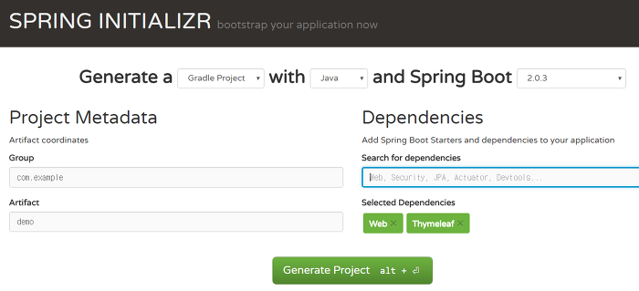 Gradle Project를 선택하고 Dependencies엔 Web과 Thymeleaf 정도 추가해주고 Generate Project로 프로젝트를 받습니다.