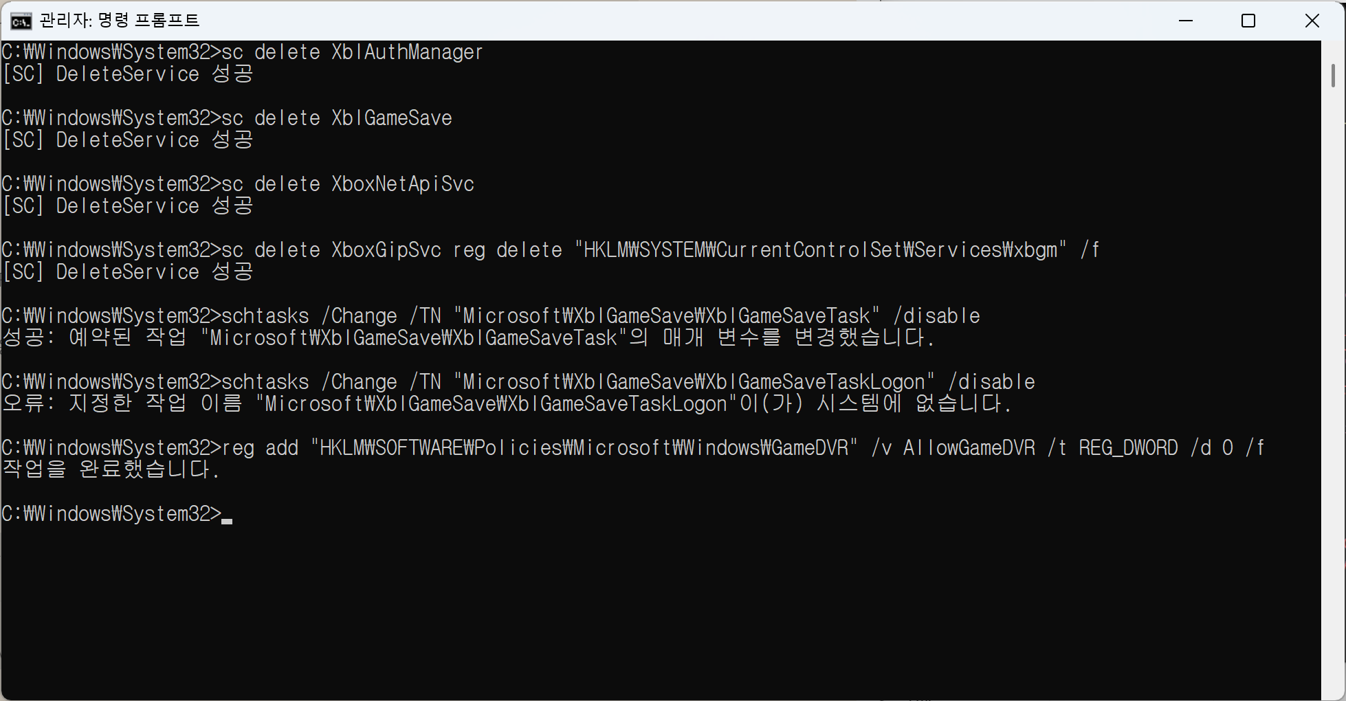 *추가로 Xbox 관련 윈도우 서비스 제거(다시 사용할려고 한다면 권장하지않음)