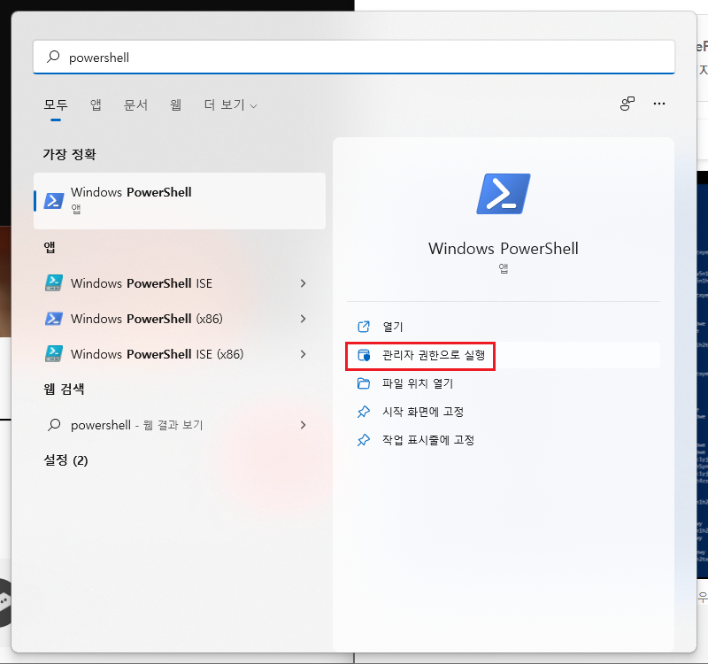 win 키를 눌러 "powershell"을 관리자 권한으로 실행하자.