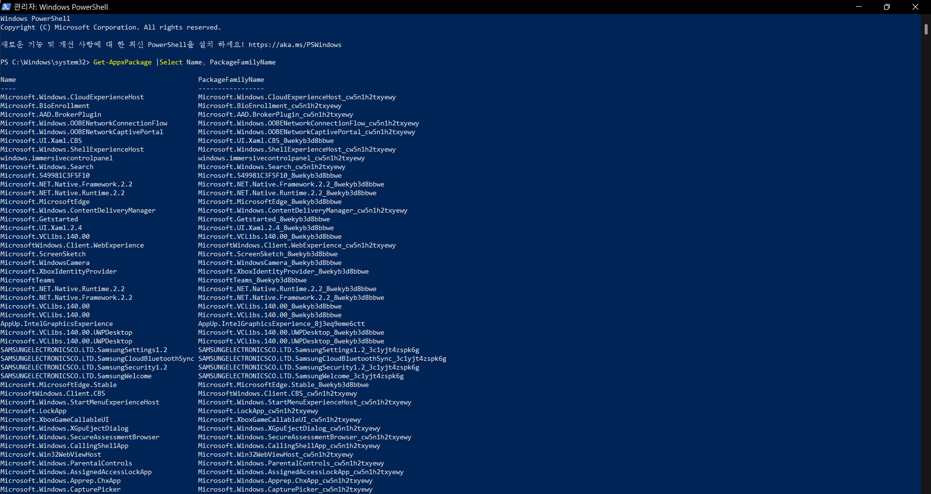 " Get-AppxPackage |Select Name, PackageFamilyName "을 입력해서 엔터