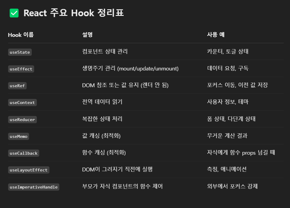 React 주요 Hook 정리표