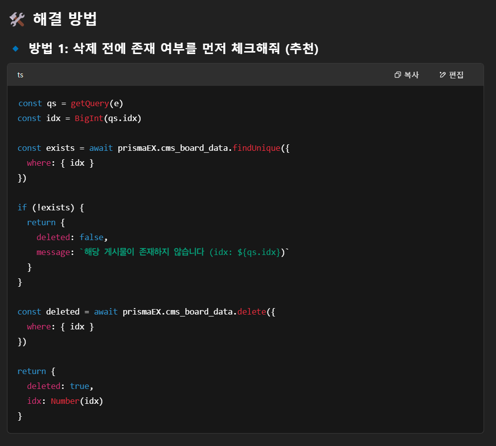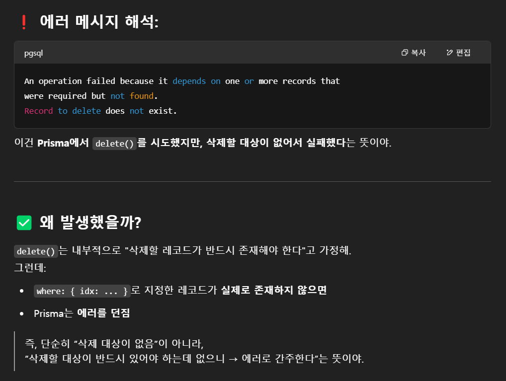 Front-End An operation failed because it depends on one or more records that were required but not found. Record to delete does not exist. 철냄비짱 2025. 4. 10. 14:52 반응형 반응형 공유하기 게시글 관리 개발세발네발 'Front-End' Related Articles Prisma Update 함수정리 Prisma CRUD 함수 정리 prisma-format (자동 camelCase 변환 CLI 도구) Prisma camelCase Case 사용