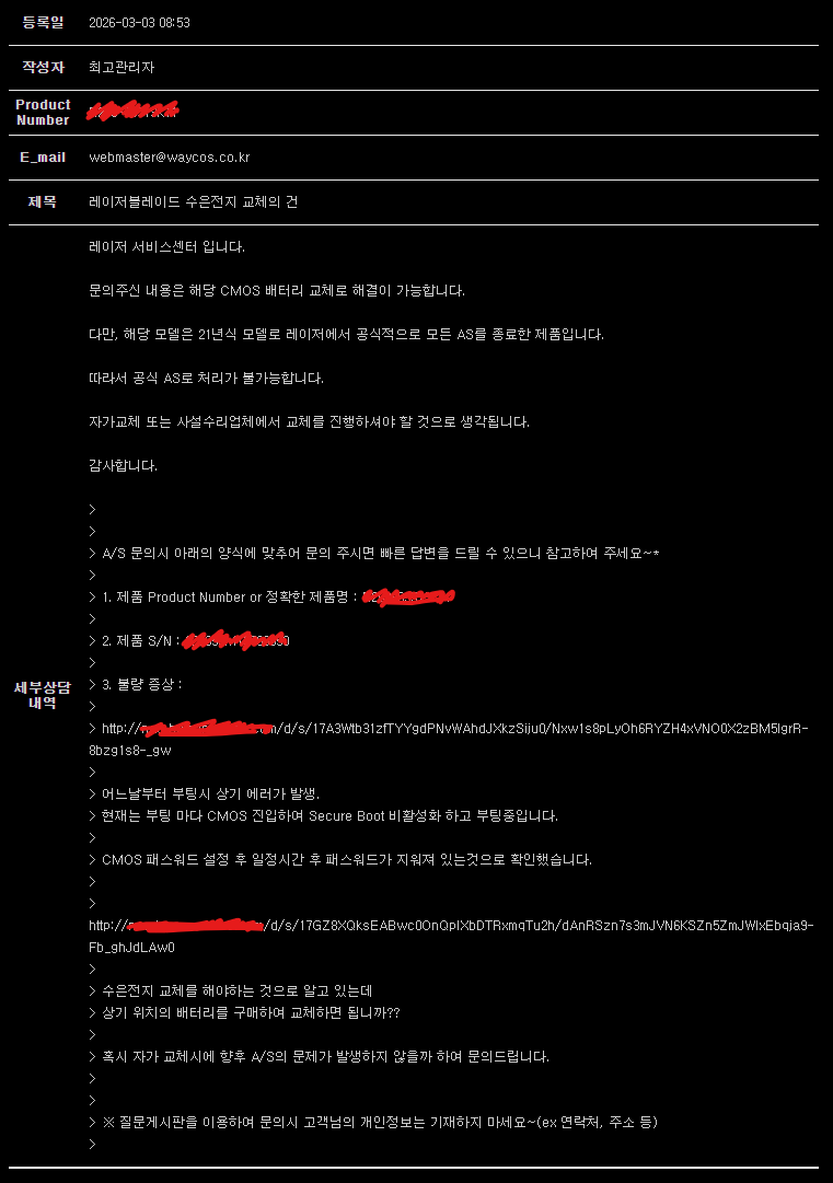 레이저블레이드는 레이저 코리아 AS 대행하는 회사는 웨이코스.