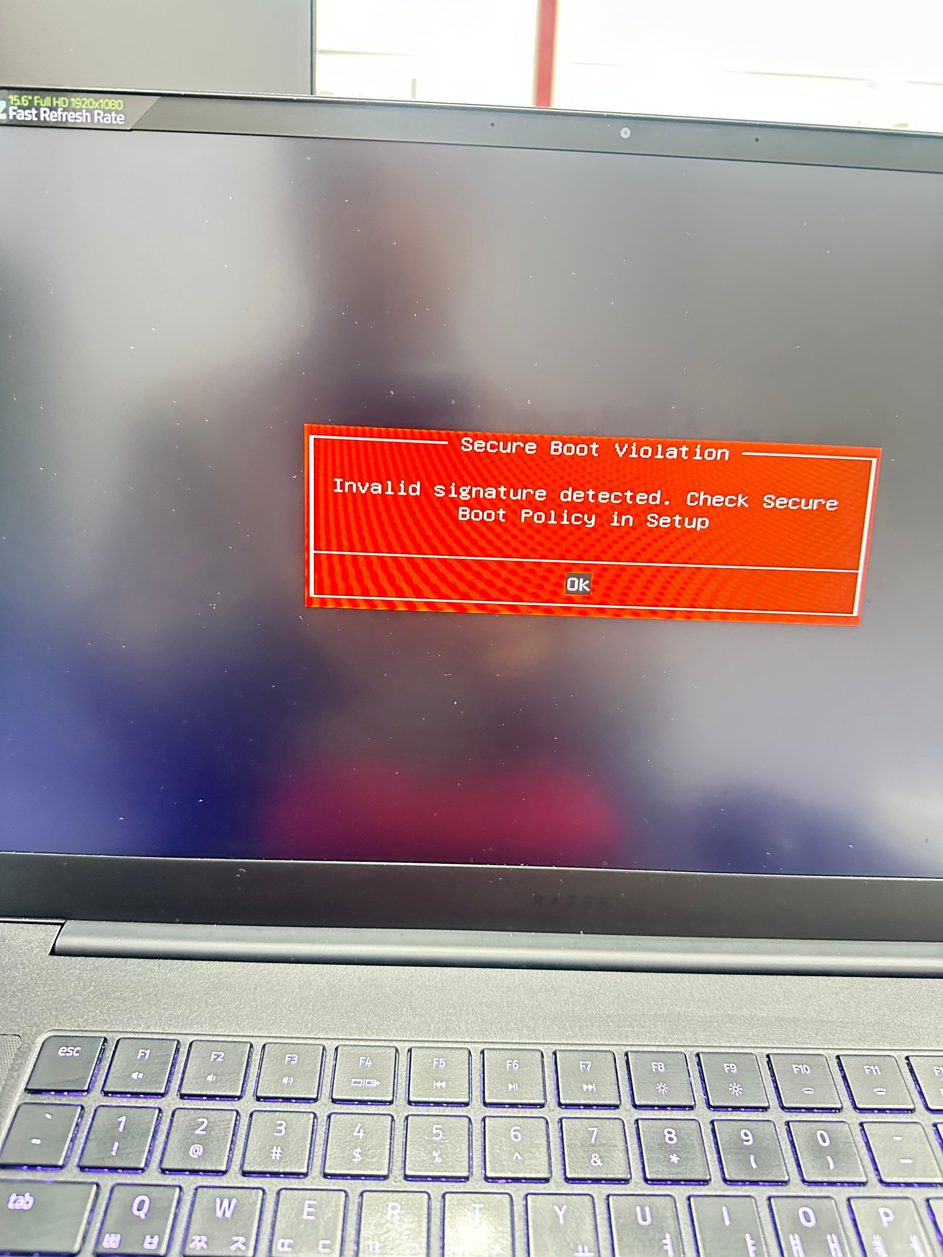 CMOS 진입하여 Secure Boot 비활성화로 임시조치.